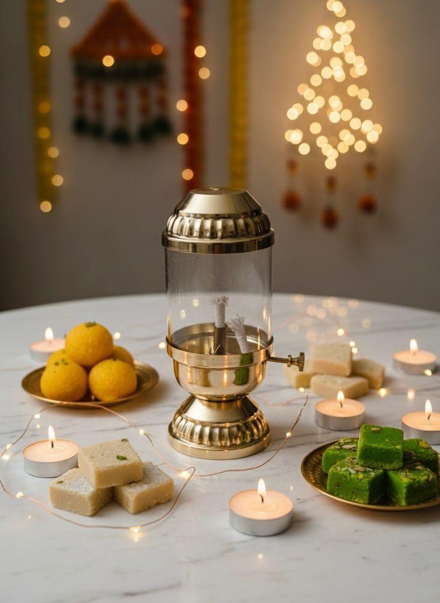 Surrounding the lamp in this setting are delightful Indian sweets like laddu, barfi, and pista burfi, creating an authentic festive ambiance. Ideal for gifting or enhancing your spiritual space, this brass lamp is a must-have addition to every Indian household.
